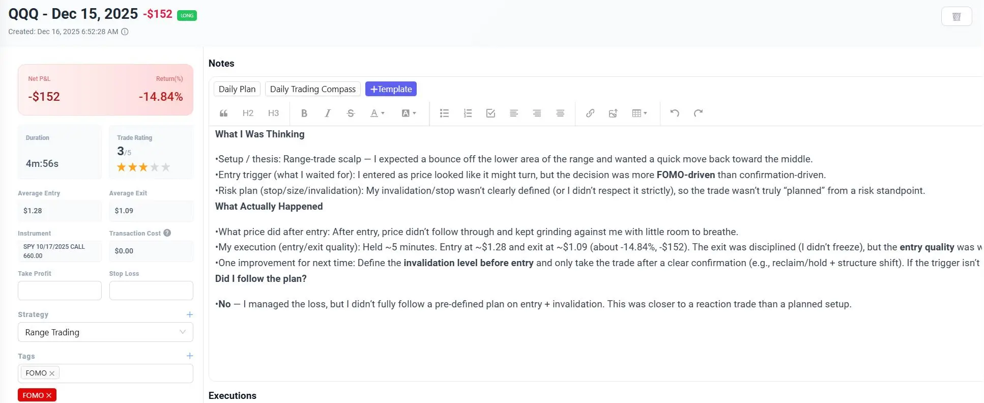 - Link Strategy to Sentiment: This note type links your narrative directly to the trade result. See exactly what you were thinking during your biggest winners—and your worst losers.